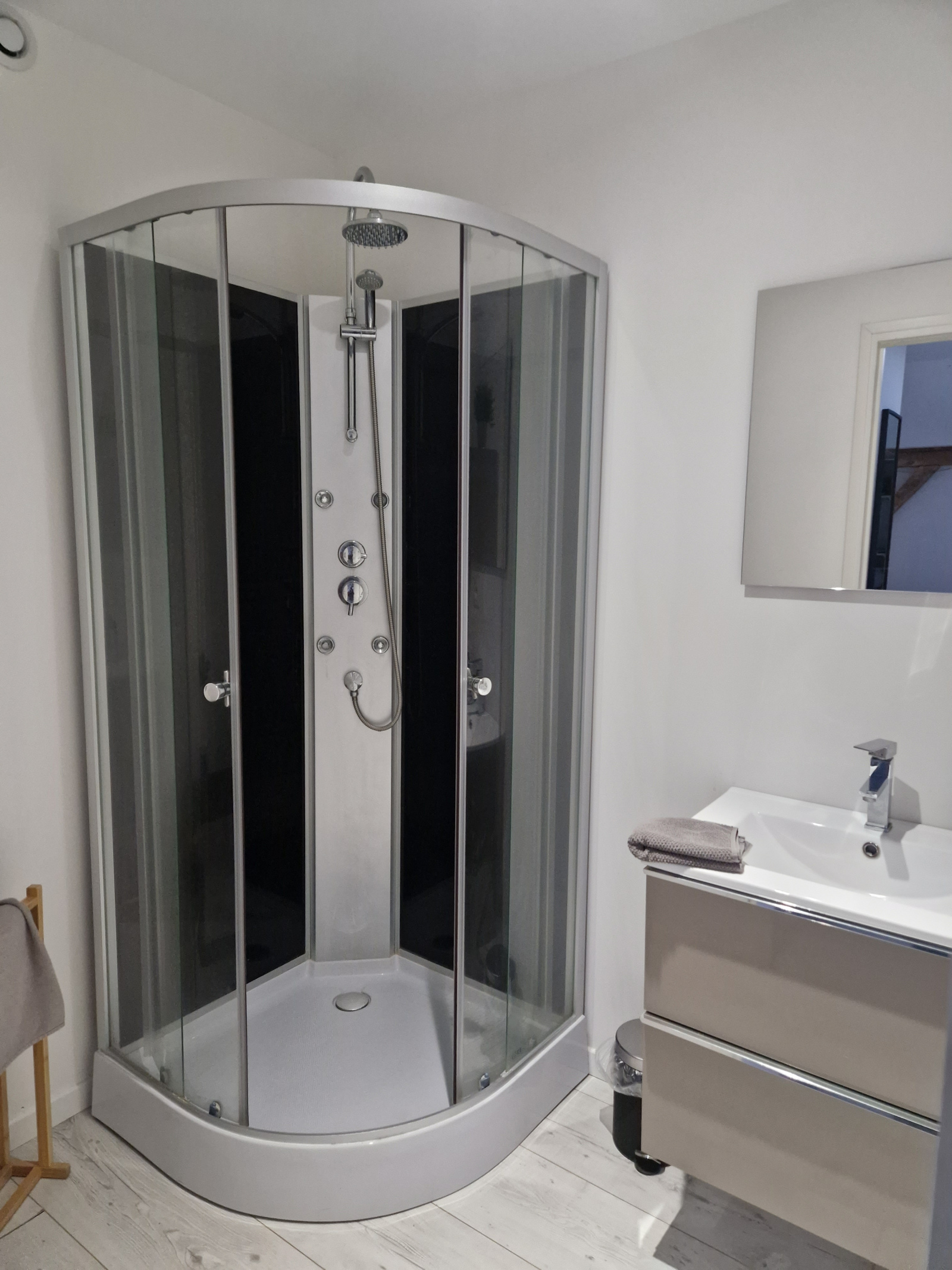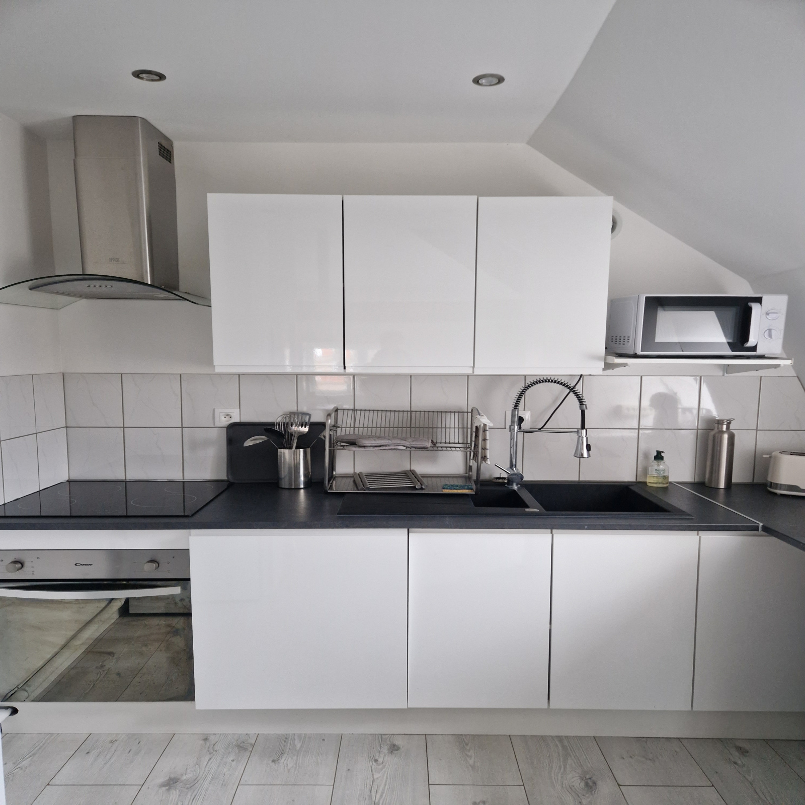 Situé 939 rue d'Ypres à Wambrechies cet appartement en duplex MEUBLE propose : au 1er niveau une première entrée avec rangements, une seconde entrée avec penderie, une pièce de vie salon-salle à manger, une cuisine équipée (plan de cuisson, hotte, four, laver-vaisselle, réfrigérateur), une salle d'eau et un WC, au 2ème niveau un couloir avec des rangements, deux coins nuit, une salle-d'eau.