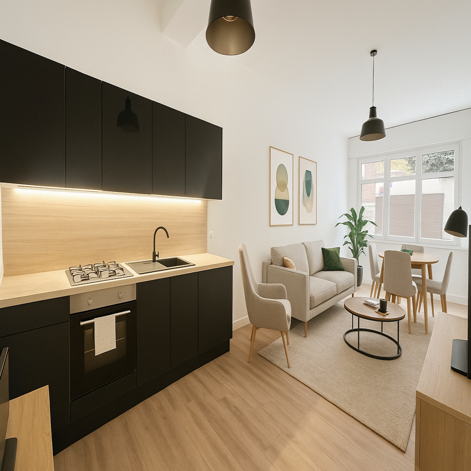 Ce bien de 40 m² loi Carrez se compose d’un spacieux séjour lumineux de 26 m² avec cuisine ouverte moderne — un espace convivial et idéal pour recevoir.