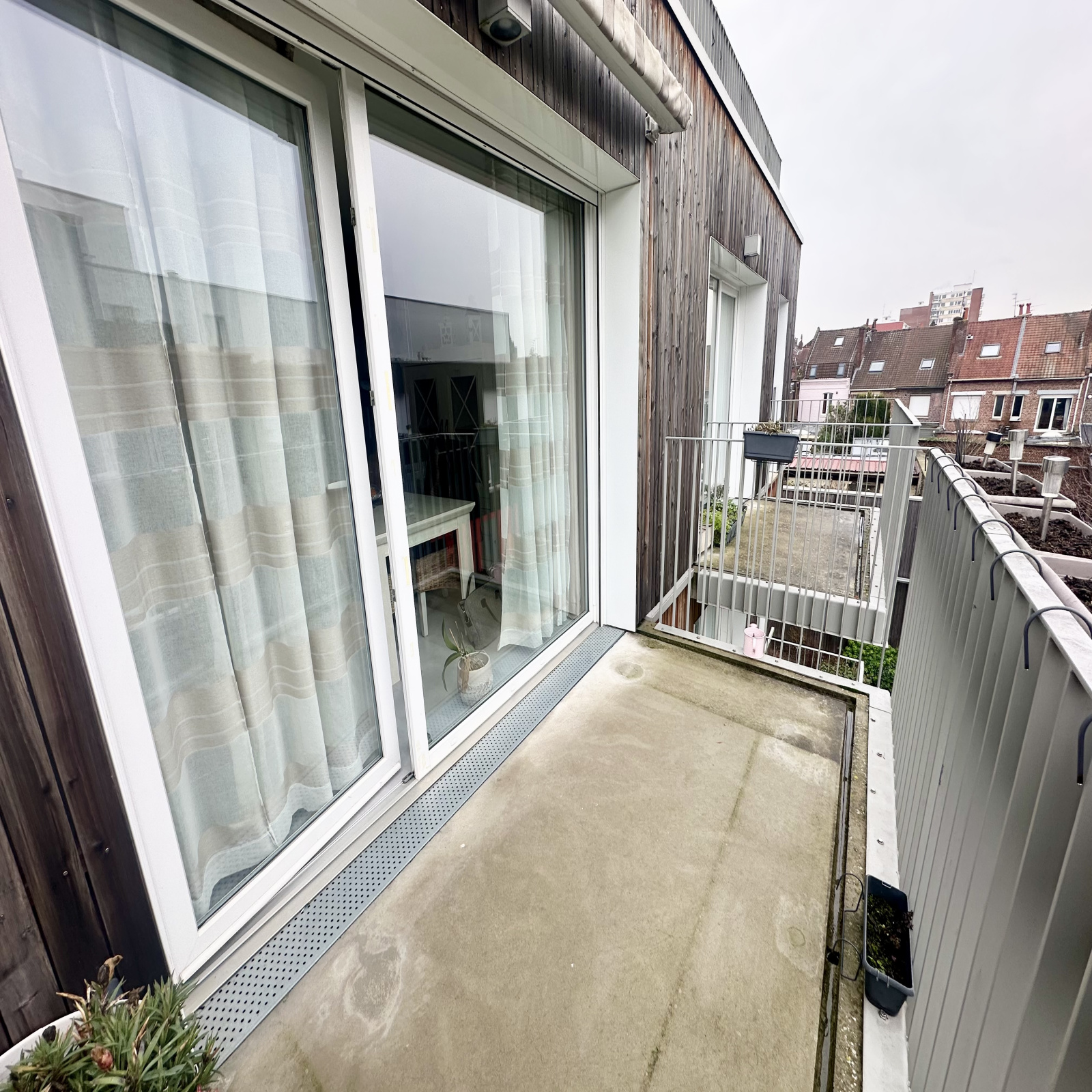 Côté extérieur : balcon exposé sud / sud-ouest attenant à la pièce de vie.