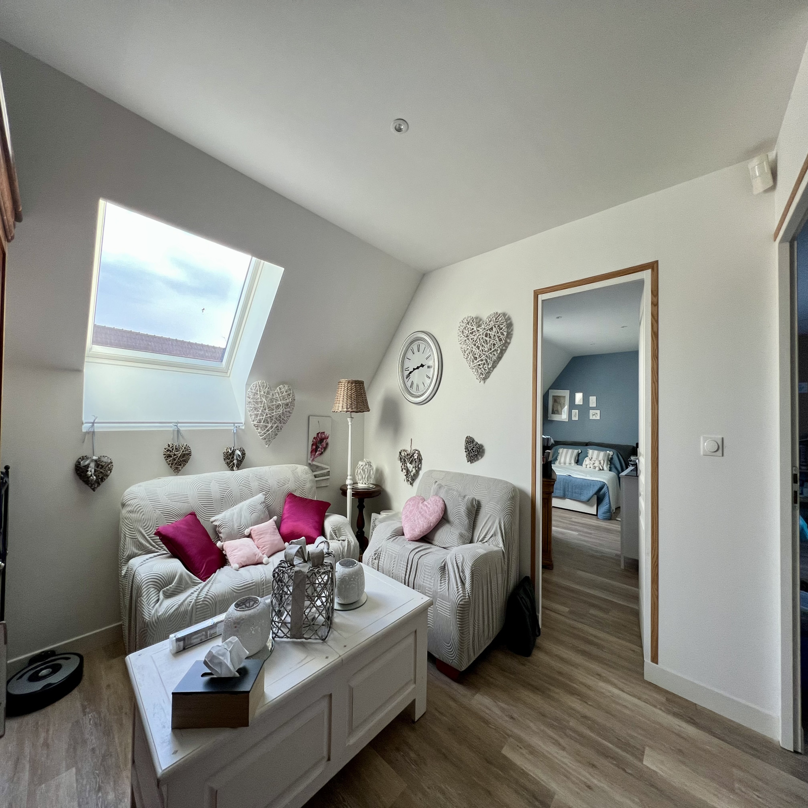 À l’étage deux grandes chambres de 17 m2, une mezzanine pouvant sevir de bureau, un dressing et des combles offrent un bel espace nuit modulable selon vos besoins.