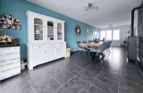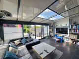 Un salon-séjour traversant de 54 m², lumineux et chaleureux grâce à sa véranda, son double puits de lumière et un poêle à pellets performant