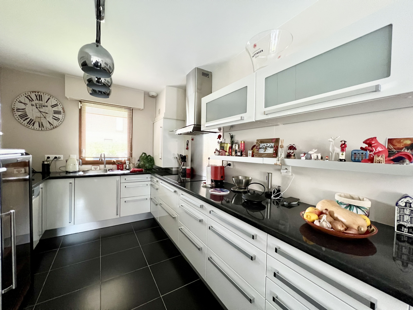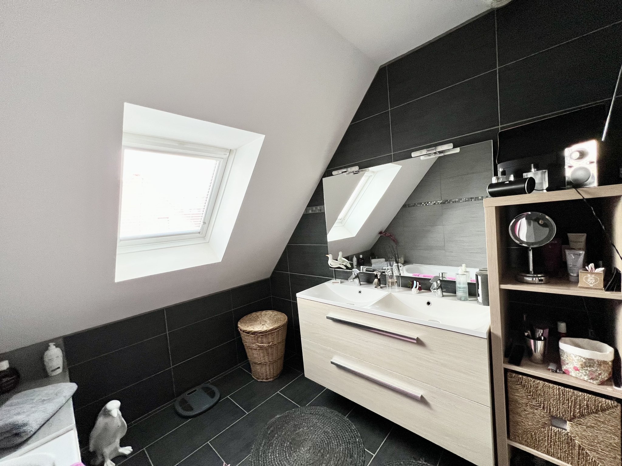 Le rez-de-chaussée se compose d’une grande entrée avec toilettes aux normes handicapées avec point d’eau et espace machine à laver, d’un salon-séjour ouvert sur une cuisine entièrement équipée, comprenant notamment un frigo et une cave à vin, l’ensemble donnant sur le jardin ainsi que d’un garage.