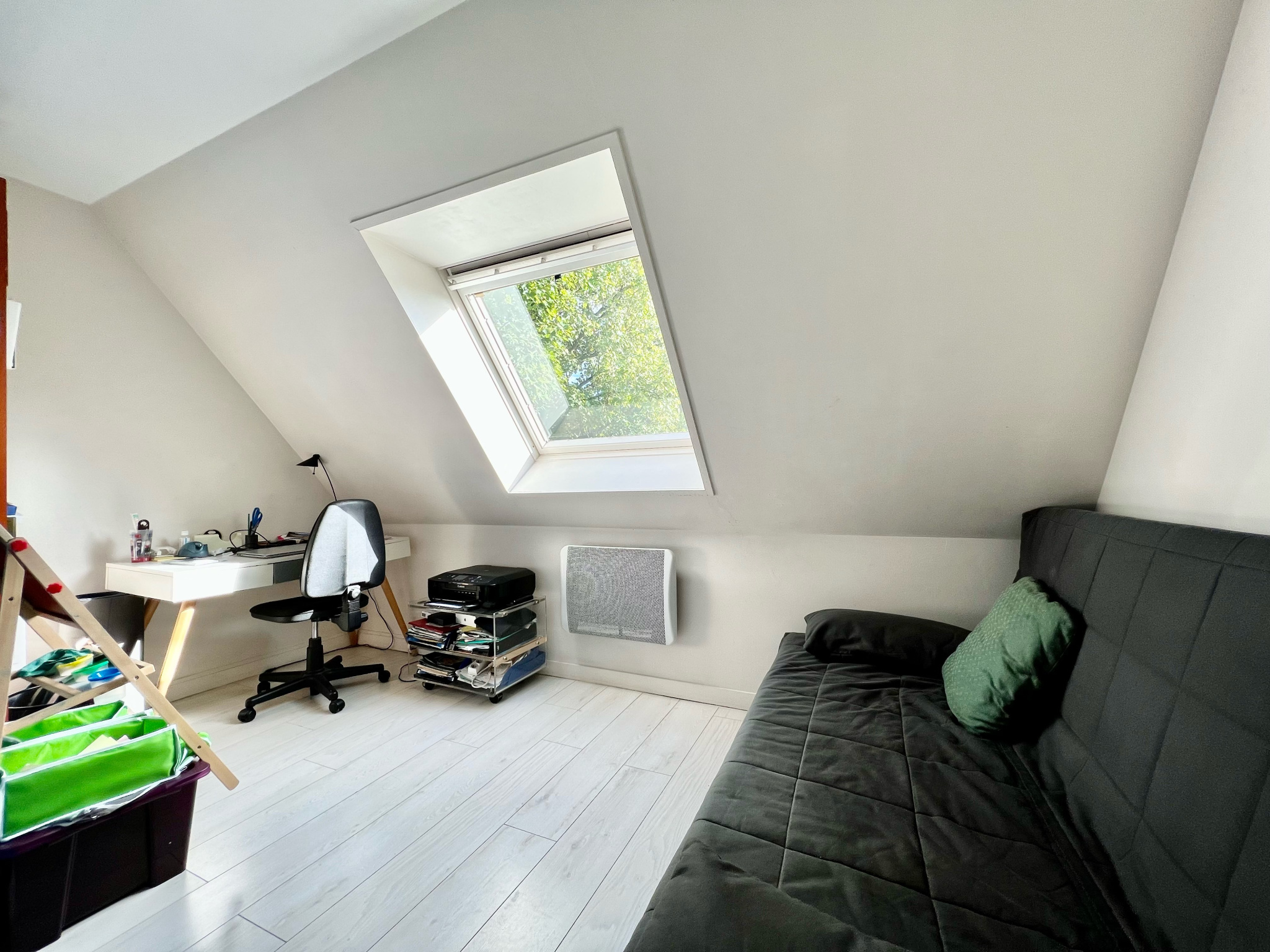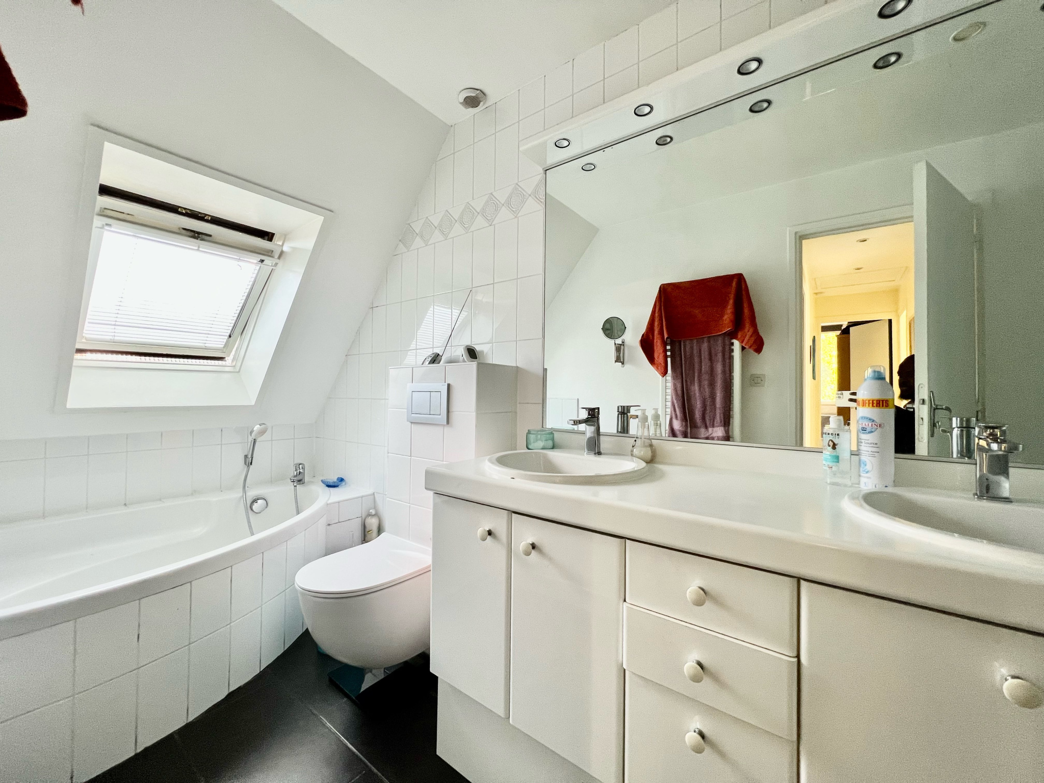 - À l'étage : 3 chambres de 10,7 / 12,15 et 10,10m2, un bureau de 7m2, salle de bains de 6,5m2 (avec douche & baignoire + WC)