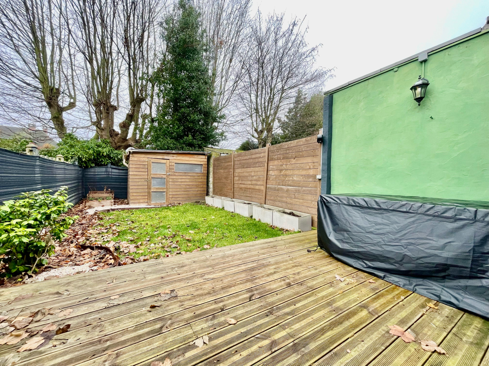 Côté extérieur : jardin avec terrasse et abris de jardin à l'abris des regards et ouvert sur le séjour.