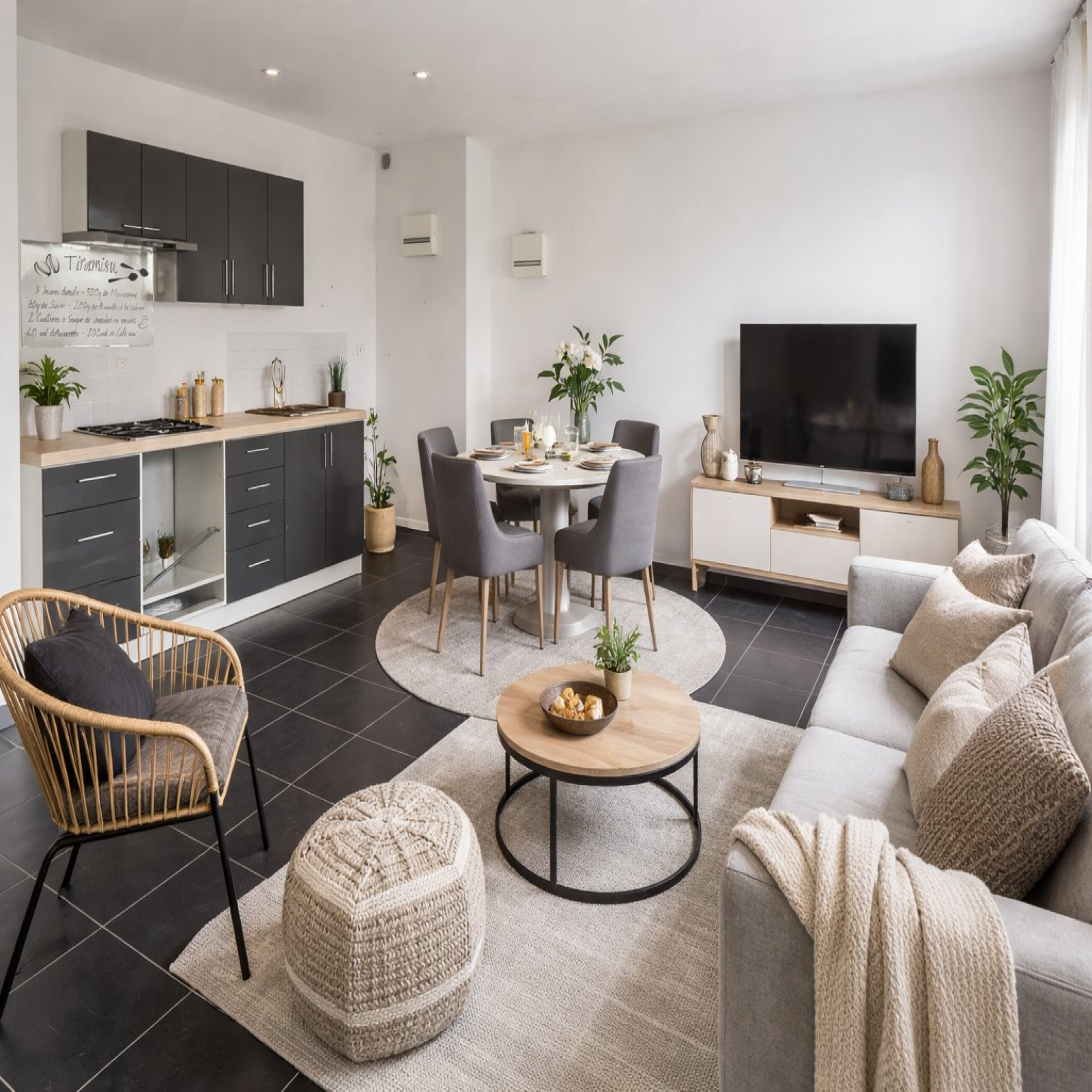 L’appartement se compose d’un salon/séjour lumineux avec cuisine ouverte, de deux chambres, d’une salle de bains avec douche et d’un WC.