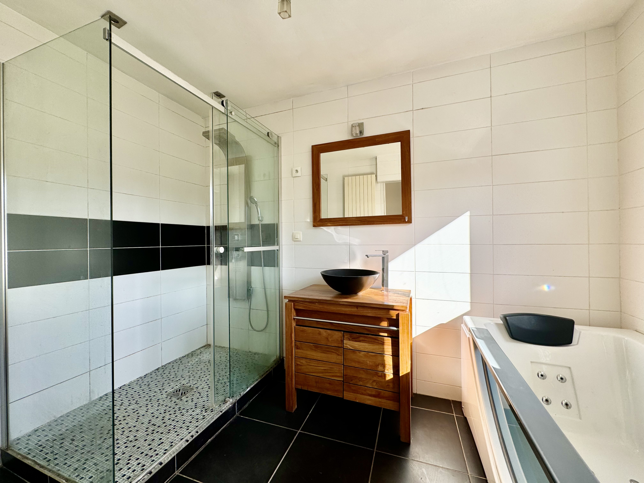 - Au rez-de-chaussée, d'un salon/séjour cuisine de 35m², une cuisine équipée de 15m2, une salle de bain avec baignoire et douche italienne, un WC